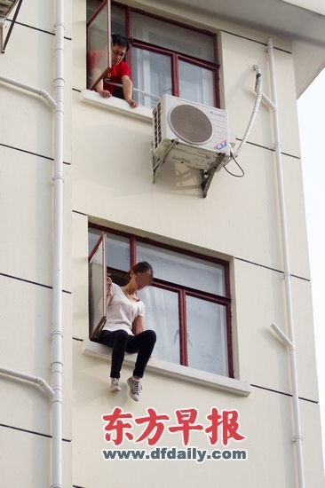 昨日12时,这名女子就坐在502室朝北的窗户前,其间一直用手机与人通话。