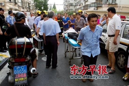 8月23日,航华二村三街坊152号,心理医生站在六楼劝说试图跳楼的女子但最终无效。 女子跳下后被急救人员迅速抬上救护车送往长宁区中心医院救治。她头部受了伤,暂无生命危险。早报见习记者 孙湛 图 昨日下午,闵行区航华二村三街坊152号,一名年轻女子疑因感情纠纷坐在五楼窗台上试图跳楼轻生,犹豫很久后,被楼下大批围观群众拍照甚至起哄。最终,16时41分左右,该女子在起哄声中纵身跃下,落在消防部门设置的安全气垫上又翻进边上的排水沟里,头部和脸受了伤,随后被送往医院急救,暂无生命危险。